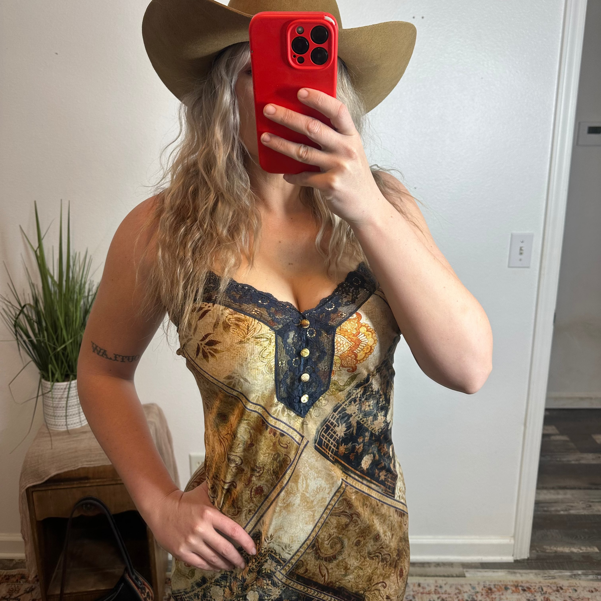 Patchwork Slip Dress featuring delicate lace accents across mixed fabric panels. The flowing silhouette flatters all body types while the intricate lace details elevate the bohemian aesthetic. Versatile enough for layering or wearing solo, this piece transitions seamlessly from day to night occasions.